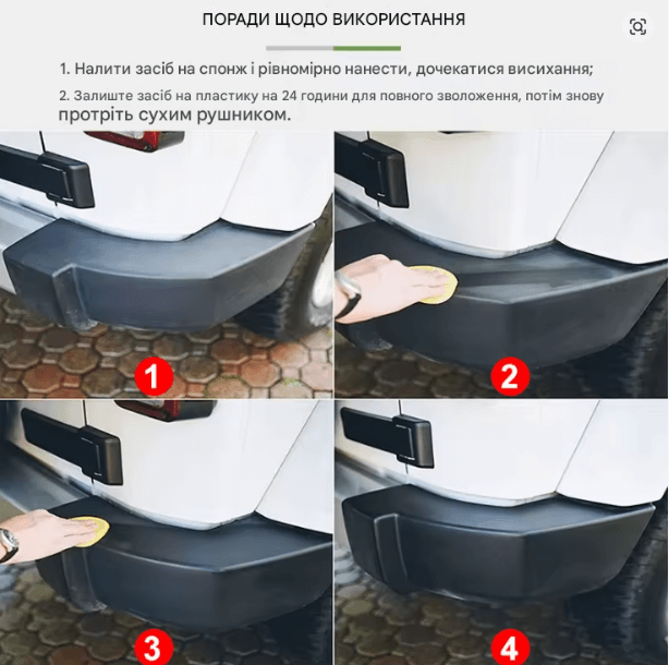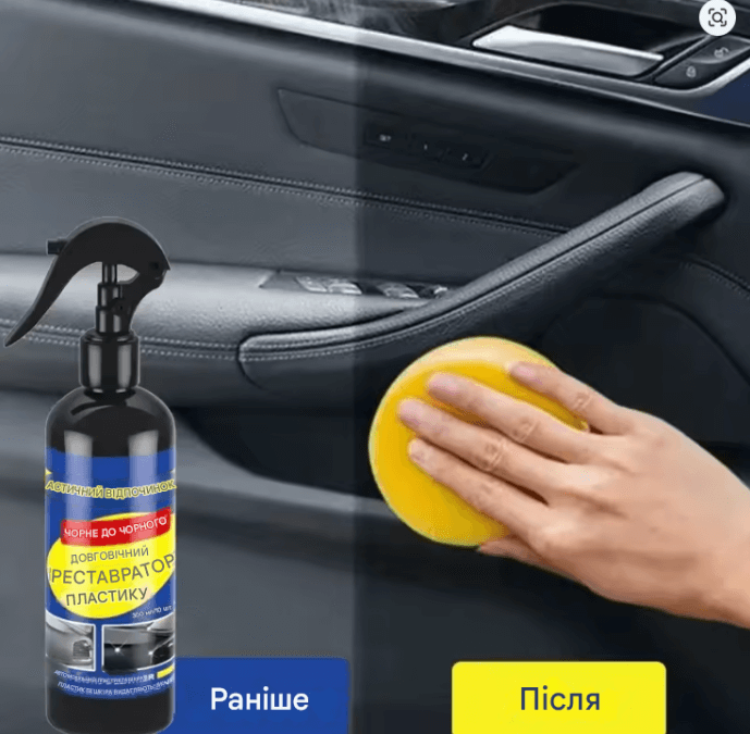 Цей продукт може ефективно усунути такі явища старіння, як відбілювання та вицвітання пластикового оздоблення, а також відновити як новий колір. Керамічне покриття високої твердості гарантує, що дощ не зможе змити покриття, а також захистить пластикові деталі протягом тривалого часу та запобігатиме старінню.